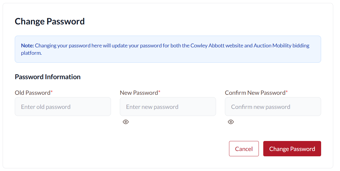 It is best to update your password from Cowley Abbott’s website as that will update your Auction Mobility Password simultaneously.