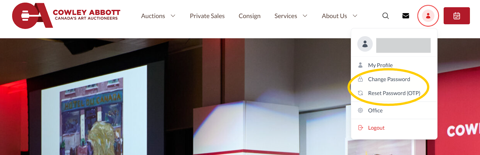 Login to Cowley Abbott and click on the user/person silhouette in the upper right corner. The dropdown menu has an option to change password or reset your password using a One Time Passcode (OTP).